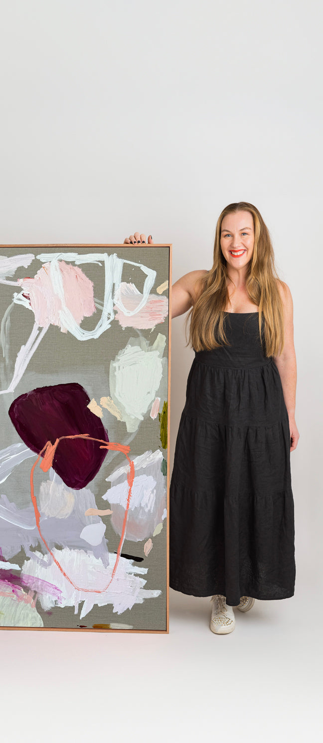 I am a Perth-based Australian abstract artist creating large-scale paintings that explore colour, emotion and the quiet stories carried through everyday life. Working mostly on raw natural linen, I build each piece through layered, instinctive mark-making, allowing the texture of the surface to become part of the final work.