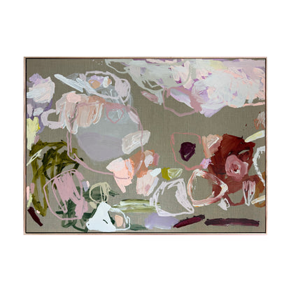 The colours move between warm neutrals, earthy tones, and soft pinks, all layered with intuitive marks that build texture and depth. It has that quiet presence I love—something that doesn’t shout, but still holds space with confidence.