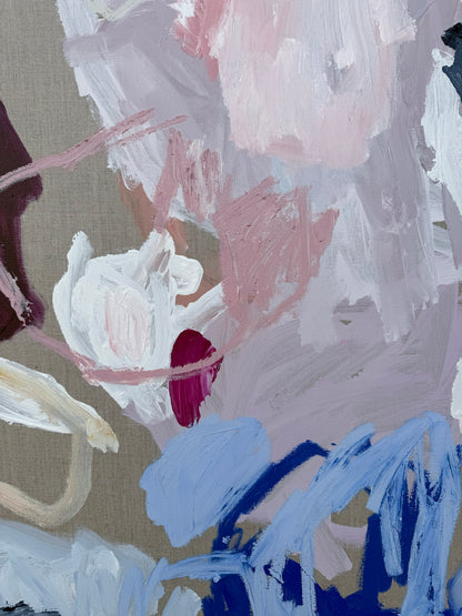 Painted on raw natural linen, this piece uses its textured background to make the colours and dynamic shapes stand out.