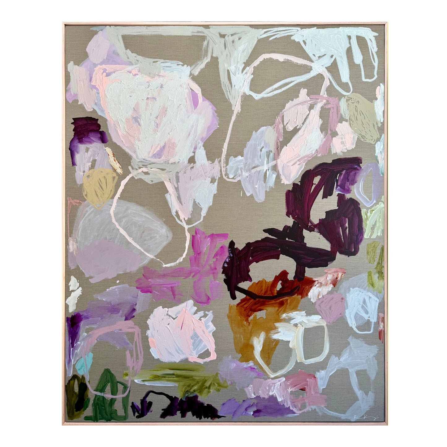Painted on raw natural linen, the textured canvas lets the bright colours and sweeping forms take on a life of their own, creating a piece that feels both bold and authentic.